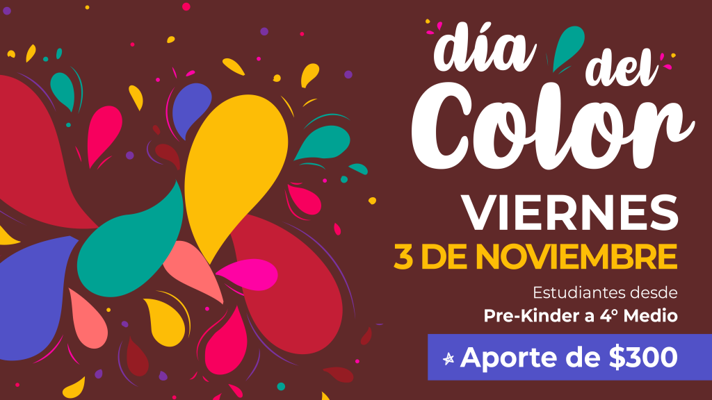 Estimada Comunidad Educativa: Junto con saludar y esperando que se encuentren bien, invitamos a nuestros/as estudiantes a participar en el «Dia del Color» , para este VIERNES 3 DE NOVIEMBRE, que tiene como objetivo reunir fondos para nuestros/as alumnos/as de 4° Medios quienes están organizando actividades para su egreso de este año. La invitación a participar de este Día del Color, se extiende para todos los