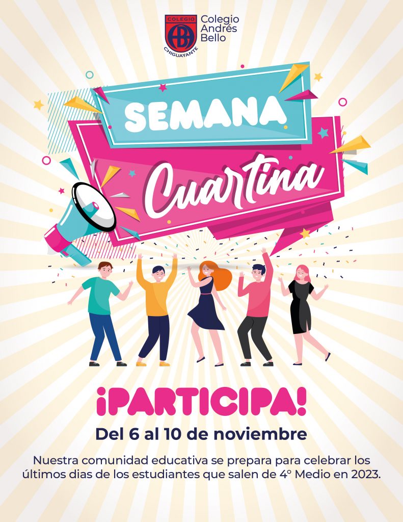 Estimada Comunidad Educativa: Junto con saludar y esperando que se encuentren bien, invitamos a nuestros/as estudiantes de 4° Medio a participar de la Semana Cuartina, especialmente pensada y organizada con mucha dedicación  para quienes dentro de pocas semanas, estarán licenciados. La jornada, que se realizará desde el día de hoy 6 y se extiende hasta el viernes 10 de