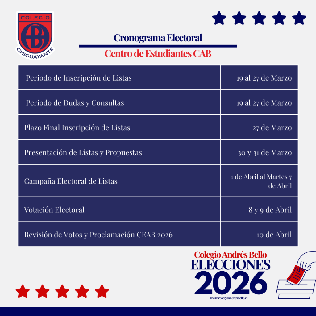 El Departamento de Convivencia Educativa del Colegio Andrés Bello de Chiguayante convoca al estudiantado de 5 ° Básico a 4 ° Medio a participar del proceso de Elección del Centro de Estudiantes (CEAB) para el presente año escolar 2026.
