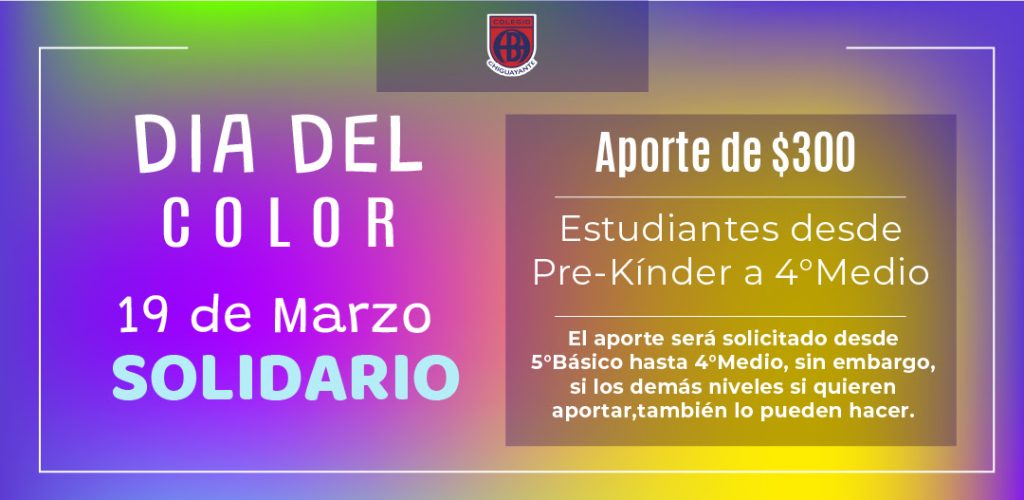 Junto con saludar y esperando que se encuentren bien, queremos invitar a nuestras y nuestros estudiantes a participar en el «Día del Color Solidario» , que se llevará a cabo el jueves 19 de Marzo. Esta actividad tiene como objetivo reunir fondos en beneficio de una familia de nuestra Comunidad  Educativa que se encuentra en una situación compleja. Asimismo, parte de lo recaudado estará destinado a apoyar la realización de las últimas actividades organizadas por nuestro CEAB 2026.